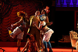 À un rythme infernal, s'enchaînent quiproquos et équivoques désopilantes, sans exclure un regard attendri sur le pauvre destin des pensionnaires. Les 11 comédiennes et comédiens, qu'accompagnent un pianiste et un contrebassiste, jouent, chantent, dansent avec un formidable entrain. Ça bouge dans le bouge !