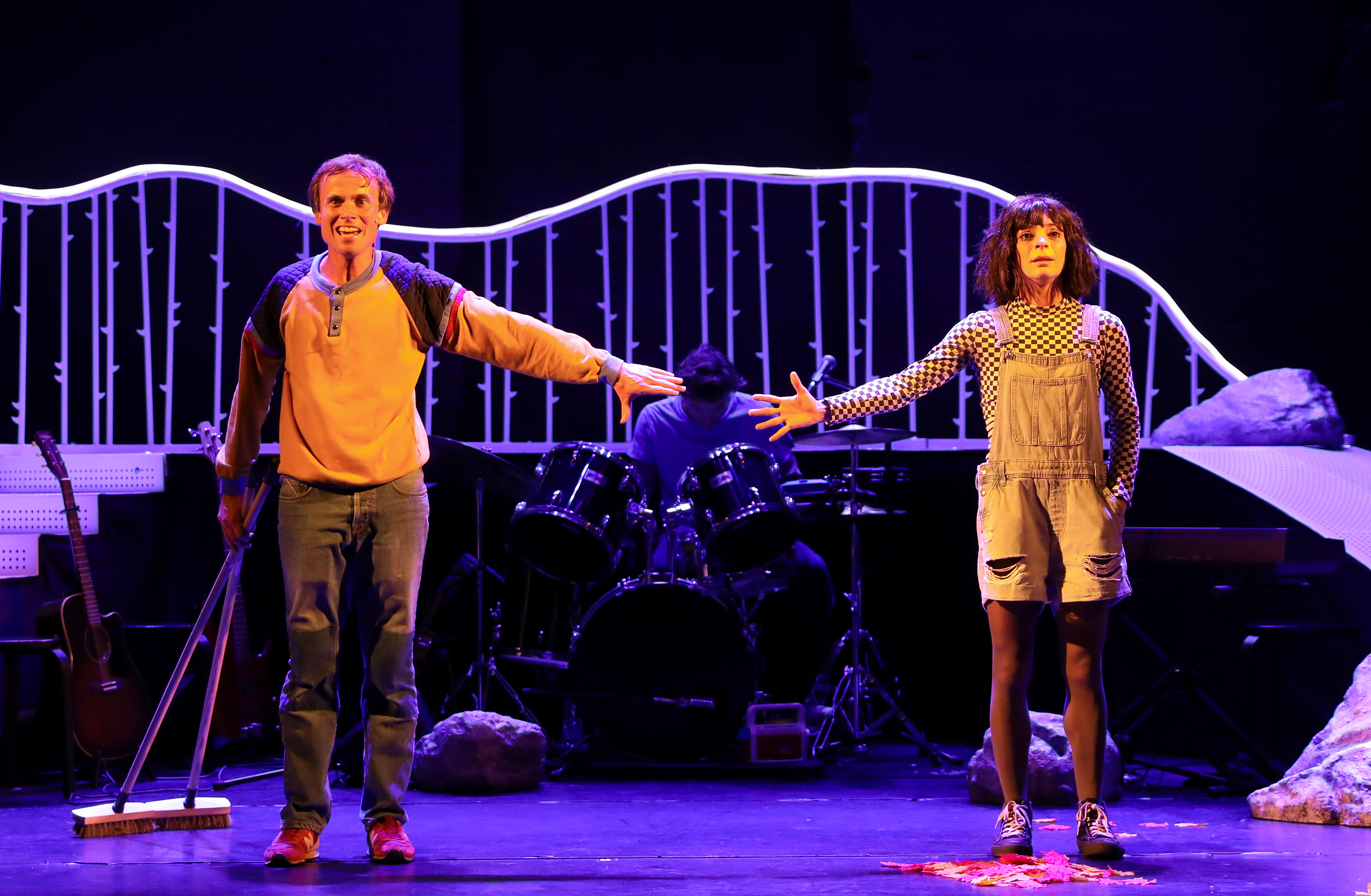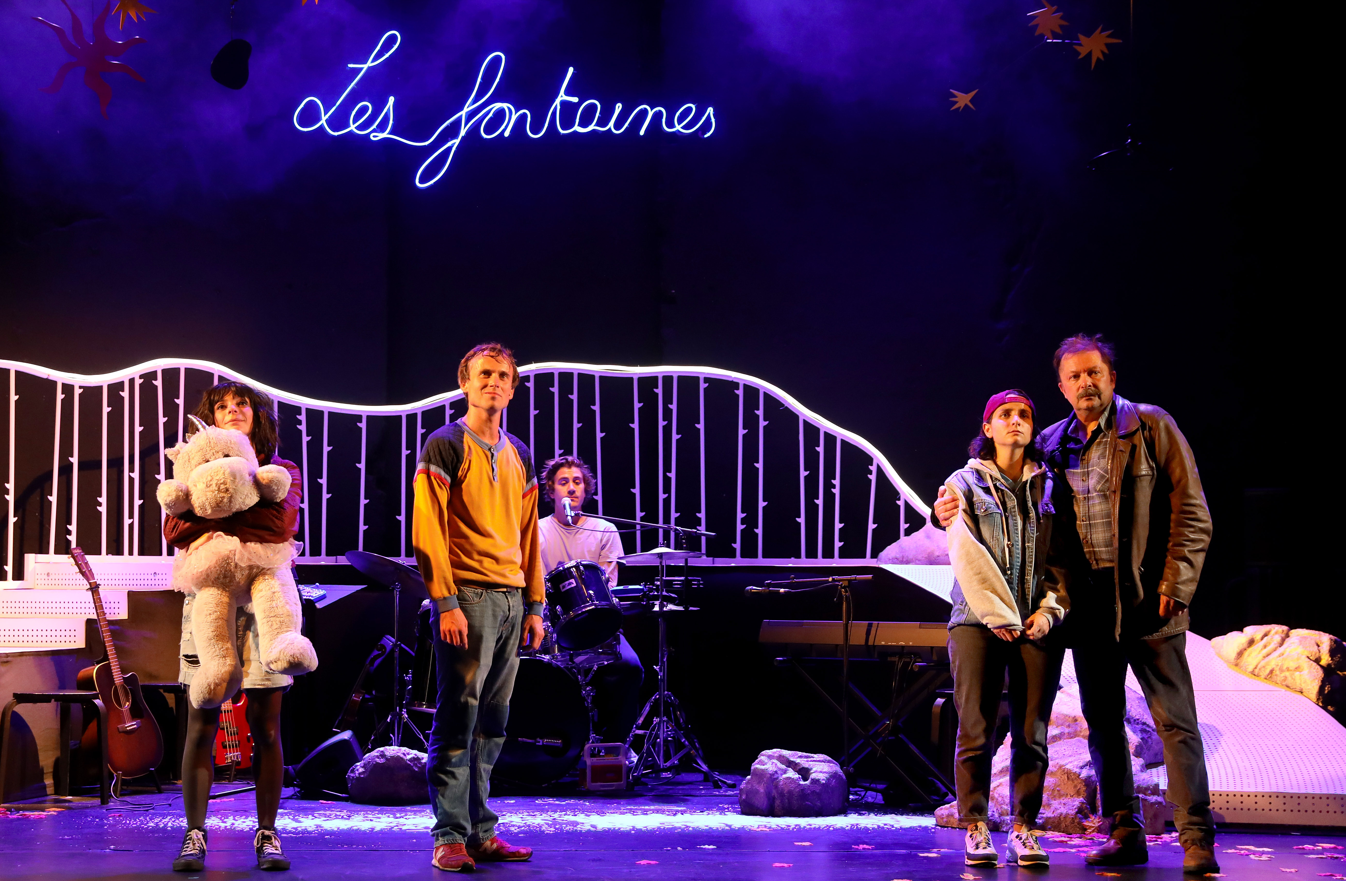 Sur scène, tout débute par les mots de Courgette et le récit de ses souvenirs. Tapis dans l’ombre, trois musiciens et une chanteuse deviennent de vrais personnages à mesure que la lumière apparaît. Le décor se dévoile, il se fait tribunal, montagne ou grand huit … Et, comme dans une pop-comédie musicale, les cinq artistes font valser rôles, costume