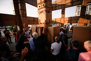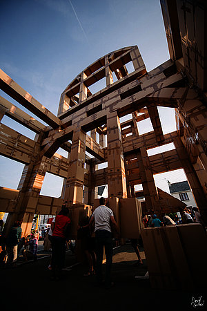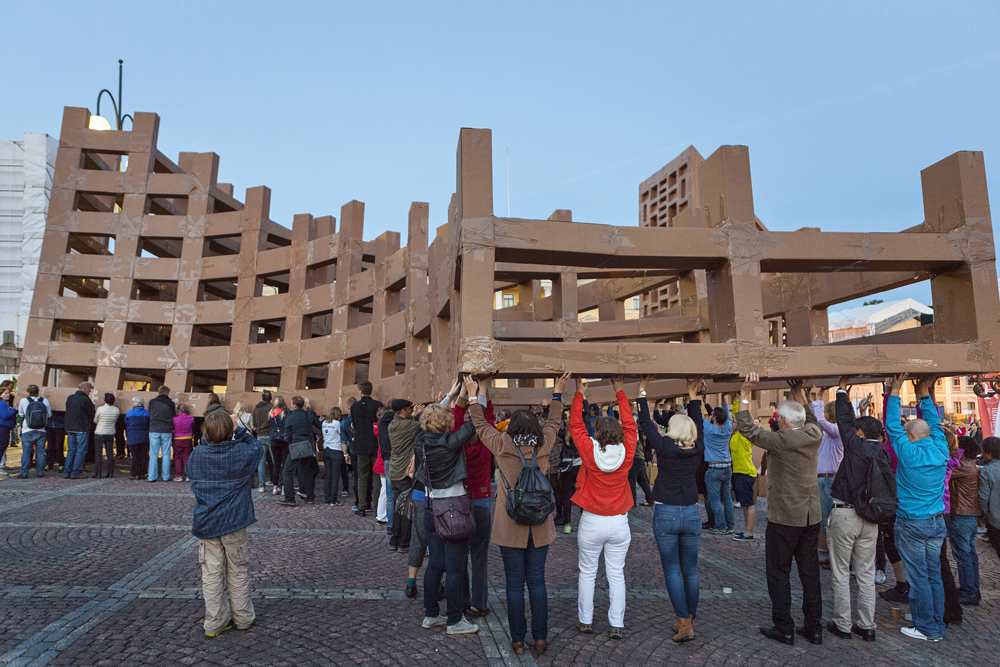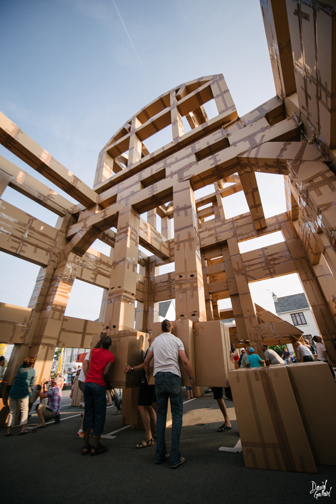 Au gré de ses voyages, le plasticien Olivier Grossetête imagine de gigantesques sculptures en cartons, pouvant atteindre vingt-cinq mètres de haut et peser plus d’une tonne. Ces constructions, conçues spécifiquement pour chaque lieu, donnent au public l’occasion de vivre une expérience humaine et artistique inédite : le public est invité à assembler des boîtes en carton vides pour édifier un bâtiment, sans grue ni machine, uniquement avec l’énergie humaine et à bras d’homme. Éphémère par nature, comme tout organisme vivant, sa fin peut avoir un sens, celui du temps qui lui est donné. Le projet se déroule en trois étapes : les ateliers en amont (du 2 au 5 octobre), l’édification en elle-même (samedi 6 octobre, de 9h à 16h), puis la destruction de la structure (dimanche 7 octobre, à 15h). Les constructions d’Olivier Grossetête sont une réflexion sur l’architecture, mais aussi une démarche sociale. L’artiste invite les habitants à se réunir autour de l’édification d’un bâtiment utopique et éphémère, et de vivre une expérience artistique.